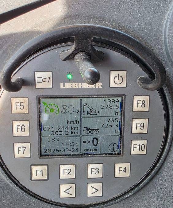 Other: 2 storage compartments at the rear of the vehicle, auxiliary heating for cab and crane cabin, rearview camera at the rear of the vehicle, jump-start kit incl. cables, upper carriage lighting package, warning beacon, radio remote control, camera system with color monitor at the boom head.